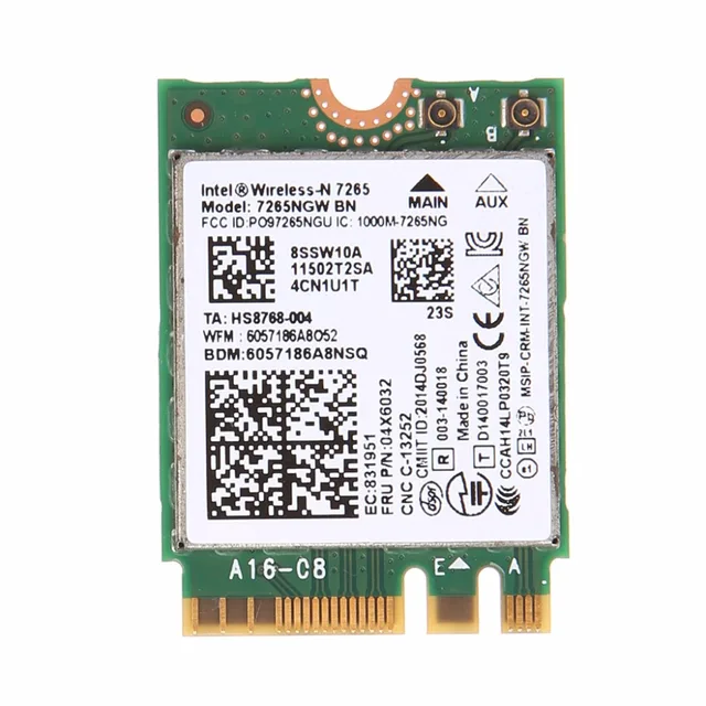 Intel Wireless-N 7265 7265NGW AN NGFF 300M Wifi+ Bluetooth 4.0 Dual Band Card. For Intel Wireless-N 7265 7265NGW BN Dual Band Bluetooth 4.0 2x2 Wi-Fi WiFi Card. $5.69 Buy It Now 4d 23h. Intel Dual Band Wireless-AC Wifi Card For Lenovo Thinkpad X230 T430 60Y3253. CAD $6.57 Buy It Now 29d 22h.,MU-MIMO. Multi-user MIMO (MU-MIMO) is a set of multiple-input and multiple-output technologies for wireless communication, in which a set of users or wireless terminals, each with one or more antennas, communicate with each other.,Downloads for Intel® Dual Band Wireless-AC 7265. Filter by. Download type. Any Download Type; Installs Intel® PROSet/Wireless WiFi Software 20.100.0 including driver for Windows® 10. Intel® Wireless Bluetooth® for Windows 7* This download record installs Intel® Wireless Bluetooth® version 20.90.1 and driver. Driver version varies ,INTEL DUAL BAND Wireless-AC 7265 7265NGW 802.11ac BT 4.0 Mini-PCI E Wifi Card - $17.20. RALINK RT5390 Half-mini Wireless N Card For HP COMPAQ 630703-001 T77H355 Intel Dual Band Wireless-AC 7265 7265NGW 802.11ac BT 4.0 Mini-PCI E Wifi Card Ultra Wi-Fi. Ultra Features.,HSW® Intel Wireless-n 7265ngw Bn 7265 Ngff Wireless Wifi Card Fru:04x6032 for Ibm: Amazon.co.uk: Computers & Accessories,The Intel® Dual Band Wireless-AC 7260 802.11ac, dual band, 2x2 Wi-Fi + Bluetooth* adapter lets you move at the speed of life with faster speeds (up to 867 Mbps), higher capacity, broader coverage and longer battery life.,This item Intel 7260NGW Dual Band Wireless-AC 7260 802.11ac, Dual Band, 2x2 Wi-Fi and Bluetooth 4.0 Intel Dual Band Wireless-AC 8260 (8260NGW) NGFF Wwifi Card 867Mbps 2.4/5GHz Dual Band Wirless - AC 7260 HMWG WiFi H/T 2x2 AC+Bluetooth 4.0 USE FOR INTEL AC 7260 HMC HALF MINI PCI-E CARD Support NUC,The Dual Band Wireless-N 7265 802.11agn, dual band, 2x2 Wi-Fi + Bluetooth 4.0 adapter delivers faster speeds (up to 300 Mbps1), greater range and more reliability. Combined with 5th Gen Intel ® CoreTM processors and exceptional wireless innovations, the Dual Band Wireless-N 7265 reshapes your connected experience at work, home or on the go.,Lenovo Intel Dual Band Wireless-N 7265 7265NGW BN NGFF Wifi Card 04X6032 See more like this. 1 product rating - Lenovo ThinkPad Yoga 14 WiFi Intel 7265NGW AC Card 00JT469 Tested Good. $8.99. or Best Offer. Free Shipping. Lenovo Dual Band Wireless AC 7265 Wifi BlueTooth 4.0 Card Intel 04X6041 7265NGW See more like this.,Intel® Dual Band Wireless-AC 8265 Desktop Kit. A new Wi-Fi solution for desktop PCs. Desktop kit includes: antennas and cables mounting brackets with the Intel® Wireless-AC 8265 Adapter that is simple to install.